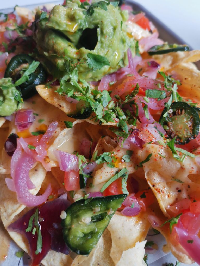 We went for the classic nachos to share followed by 2 different options from the taco menu. The nachos were generously portioned, loaded with tangy pink onions, a light vegan ‘queso’, fresh guac and chunky salsa. To be honest, a tray of these to share with a couple of the frozen margaritas would have made a fab pit stop snack from sales shopping – particularly as the location of Kingly court is so central.