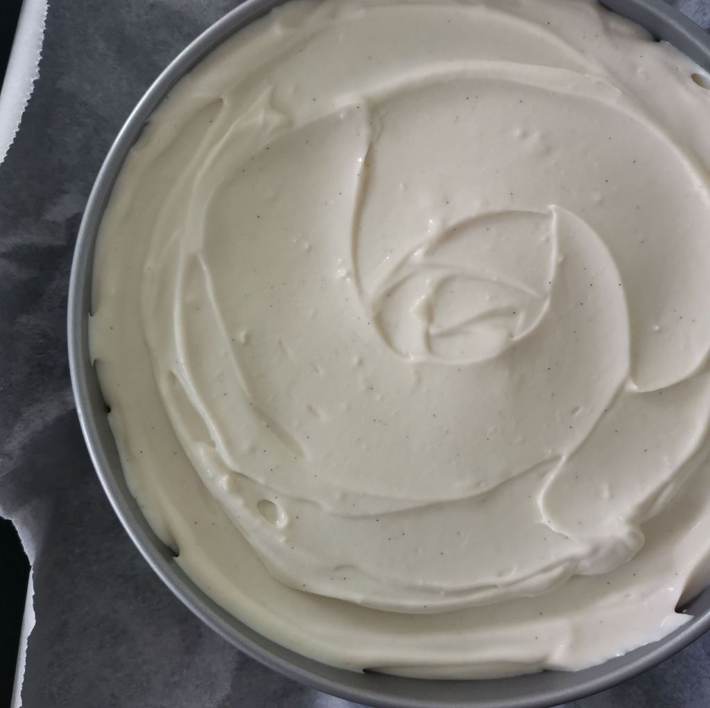 Decant the chreamy cheezecake filling on top of your buttery biscuit base, ensuring that you go right up to the edges (if your sprung tin has a non stick coating, you shouldn’t need to grease the sides of the tine beforehand.)