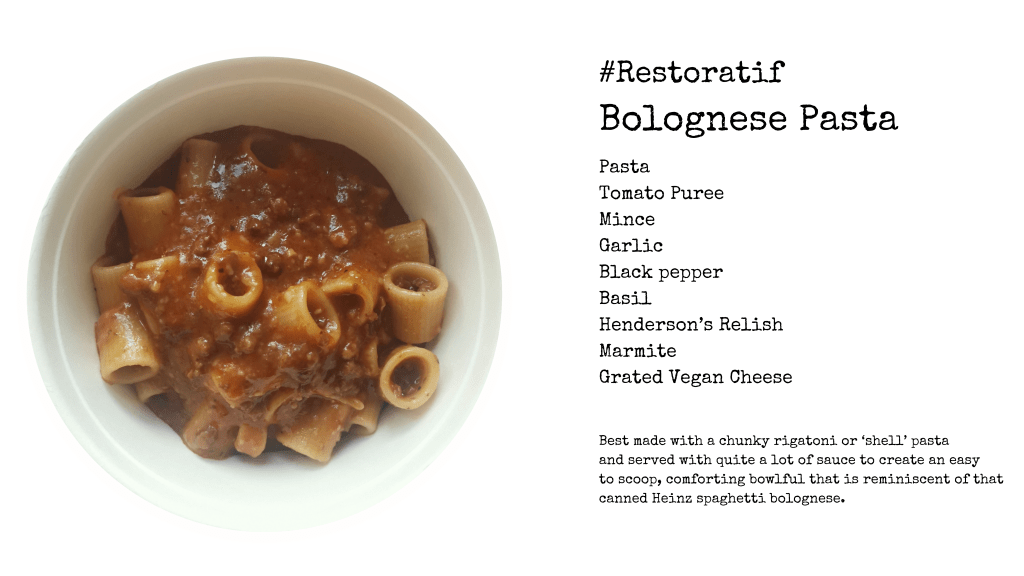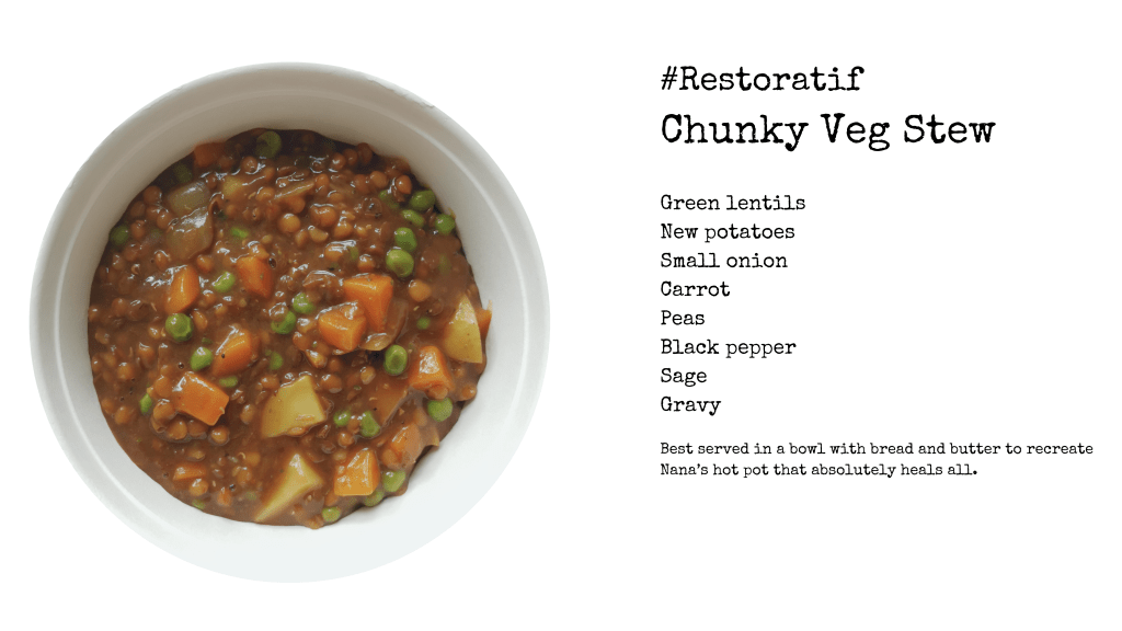 The bowls below represent a cross section of the the ‘Restoratif’ preferences from the project – The key ingredients are outlined alongside any particular comments relating to the serving suggestions (which are quite often linked to maternal family members) and are more often than not, always in the form of ‘easy to eat’ meals with just a simple spoon enabling the restorative power of food to be dispensed with ease on the sofa, under a warm blanket in front of a comforting box set binge.
